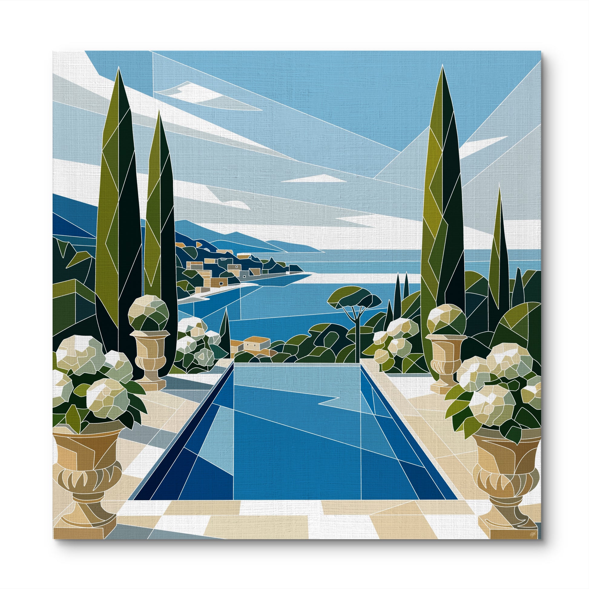 The painting carries the viewer into a world of serene indulgence: a terrace framed by tall cypress trees opens onto an infinity pool that merges seamlessly with the horizon of the sea. White blossoms in elegant stone planters soften the grandeur, while the coastline stretches into the distance with villas nestled among green hills. Shades of blue, green, and sand create a composition of freshness and balance, where water, sky, and landscape unite. The artist reveals that true luxury is found in the stillness of such views—moments where nature’s beauty and human design harmonize in perfect calm.