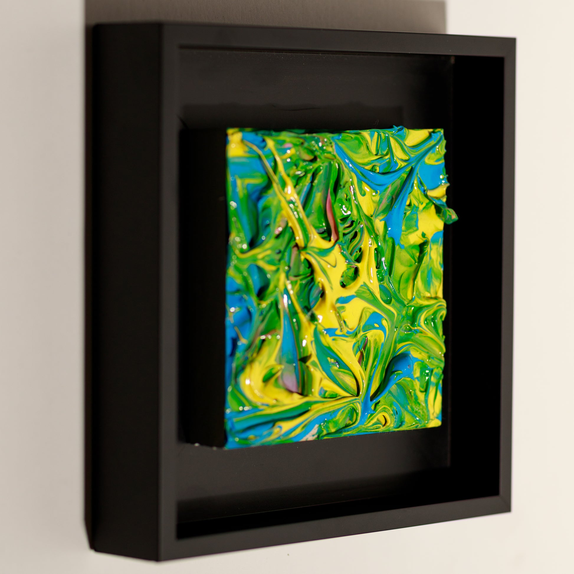 Juicy Baby (2024) by Steve Banaszek is an acrylic painting on a wood block, measuring 6.75 x 6.75 x 1.75 inches. The vibrant artwork is presented in a sleek black frame, enhancing its bold colors and dynamic composition. This piece offers a fresh, playful perspective, making it a unique addition to any collection.